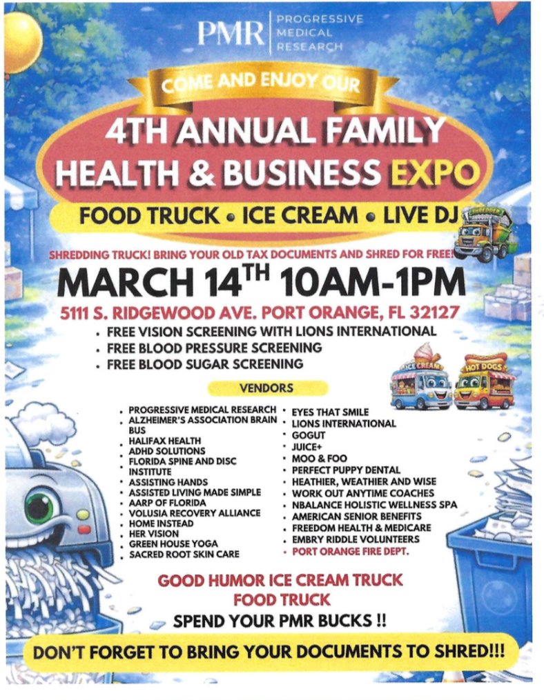 Progressive Medical Research is inviting the community to its 4th Annual Family Health & Business Expo on March 14th from 10AM to 1PM at 5111 S. Ridgewood Ave, Port Orange, FL 32127